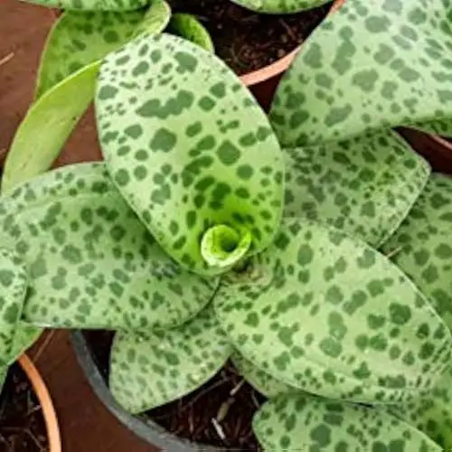 Drimiopsis kirkii – is a distinctive bulb with rosettes of light green to silvery green lance-shaped leaves irregularly and densely dotted with darker green to green-brown spots – very attractive. Giant Squill sports narrow spikes of white flowers somewhat freely.